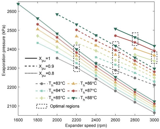 Evaporation pressure variation under different expander rotational speeds and working fluid pump flow rates at heat source temperatures above the rated level.