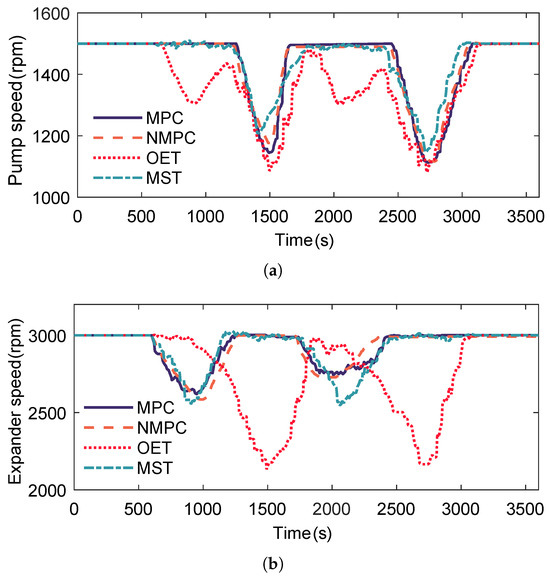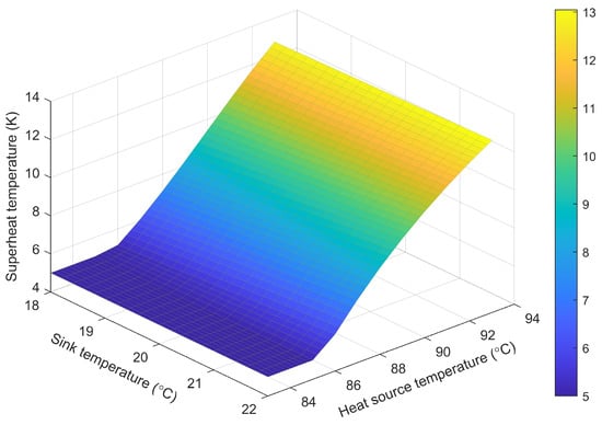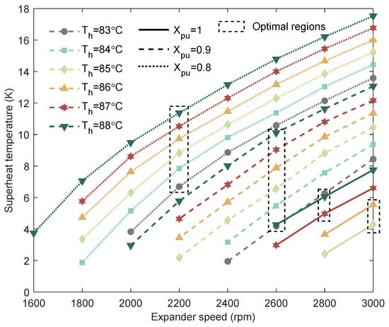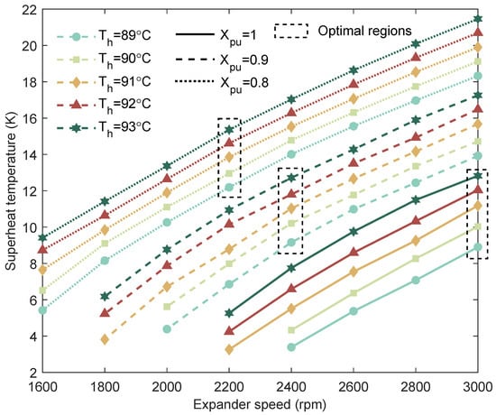 From Figure 7, it can be observed that the degree of superheat is strongly influenced by various parameters. As the rotational speed decreases, the superheat degree also declines. This occurs because a lower rotational speed reduces the  at the expander inlet, which elevates the evaporation pressure and consequently diminishes the superheat. Similarly, increasing  also reduces the superheat degree, whereas higher heat source temperatures enhance it. Integrating these observations with the results in Figure 5, it is evident that an optimal superheat degree exists that maximizes the system power output. Notably, while the minimum superheat temperature (MST) control strategy ensures safe operation, it yields suboptimal power output and fails to achieve the global optimum across different heat source temperatures.