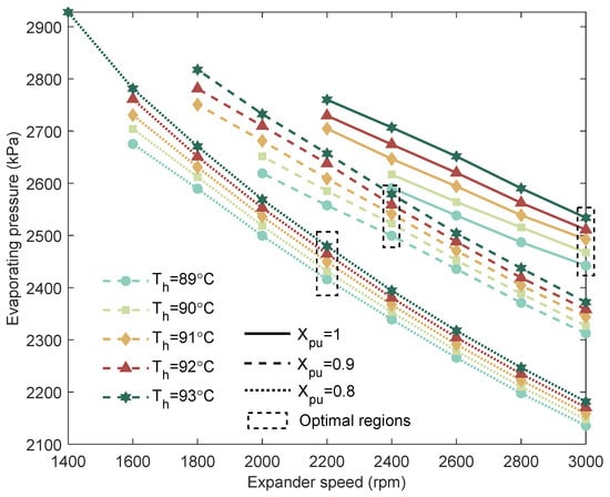 As illustrated in Figure 6, a decrease in expander rotational speed results in an increase in evaporation pressure. Similarly, a higher working fluid flow rate also leads to a rise in evaporation pressure. In the ORC power generation system, the evaporation pressure is influenced not only by the flow rate but also by the heat source temperature and expander rotational speed. Among these factors, the working fluid flow rate exerts a greater influence than the heat source temperature. When combined with the power output characteristics shown in Figure 5, it becomes evident that an optimal evaporation pressure exists across different heat source temperatures. This optimal condition can be achieved through coordinated adjustments of the pump and expander rotational speeds.