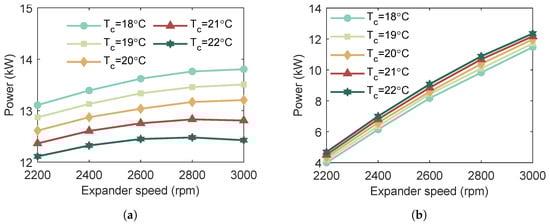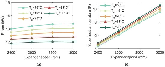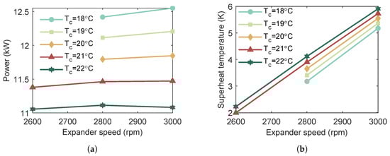 Figure 11 illustrates the influence of expander rotational speed on the system’s output power and superheat degree under different cooling water inlet temperatures. As shown, an increase in cooling water inlet temperature results in reduced output power and an elevated superheat degree. This finding indicates that, under conditions of fixed expander rotational speed, a near-linear relationship exists between the superheat degree and output power. Accordingly, the ORC system exhibits an optimal superheat degree at which maximum power output can be achieved.