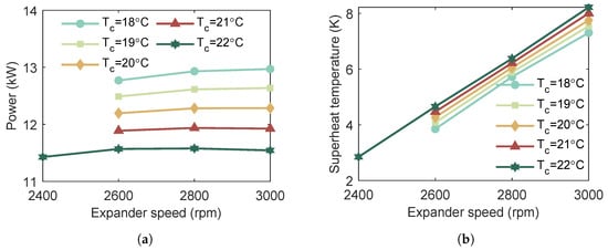 Effect of expander rotational speed on net power output and superheat under varying heat-sink conditions at a fixed heat-source temperature of . (a) Effect of expander rotational speed on net power output. (b) Effect of expander rotational speed on superheat.