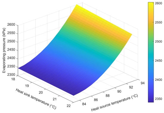 The heat sink temperature exerts a non-negligible influence on the thermodynamic performance of the ORC system. Therefore, its effect must be considered in the design of the MPPT strategy. Owing to the relatively narrow operating range of the heat sink, the optimal evaporation pressure and superheat degree are investigated within a temperature range of 18 ∼ . Simulation results show that variations in heat sink temperature have only a marginal effect on evaporation pressure. Accordingly, the effect of expander rotational speed on evaporation pressure is not analyzed in this study.