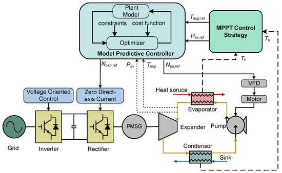 Many countries have successively announced net-zero carbon emission targets to address the escalating dual challenges of global climate change and energy insecurity. Power generation from low-grade heat sources offers a practical pathway toward achieving these goals []. Such heat sources are widely distributed in industrial waste heat, geothermal energy, solar thermal utilization, biomass energy, and ocean thermal gradients. Among various thermal energy conversion approaches, the Organic Rankine Cycle (ORC) has been extensively recognized as a leading technology for harnessing low-grade heat and transforming it into electricity, offering both high applicability and significant potential for energy recovery []. Maximizing the conversion efficiency from available thermal energy to electricity is a critical objective for ORC systems. However, in many thermal power generation scenarios, both sink and heat source temperatures vary with time, leading to off-design operation []. Consequently, Maximum Power Point Tracking (MPPT) control is required to adapt operating conditions and sustain optimal power output [].