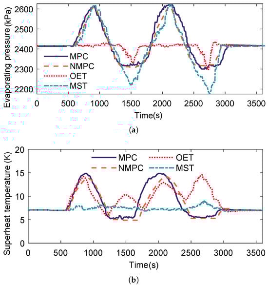 The two most widely adopted control strategies are the Minimal Superheat Temperature (MST) strategy [] and the Optimal Evaporating Temperature (OET) strategy []. The OET strategy is theoretically derived and depends on heat source temperature, cold source temperature, and working fluid flow rate. In practice, the optimal evaporating temperature is calculated under given operating conditions and used as the setpoint. By contrast, the MST strategy regulates the evaporator outlet to maintain a small degree of superheating.