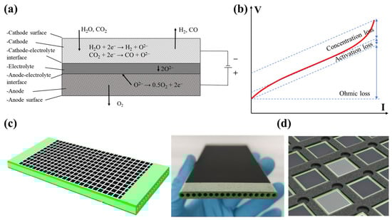 (a) Schematic diagram of co-electrolysis by SOEC; (b) schematic illustration of a typical I–V curve of SOEC and corresponding losses; (c) schematic image and photograph of flat tubular SOECs; (d) photograph of planar SOECs.
