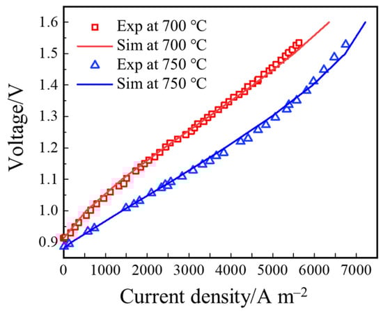 Figure 3 compares I–V curves from simulation and from experimental results extracted from a previously published report []. These simulation results are in good agreement at operating temperatures of both 700 °C and 750 °C, validating the as-developed model.
