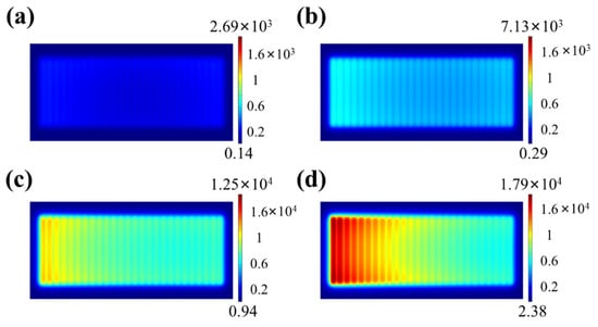 Current density distribution of electrolyte at different voltages of (a) 1 V; (b) 1.2 V; (c) 1.4 V; and (d) 1.6 V.