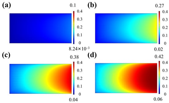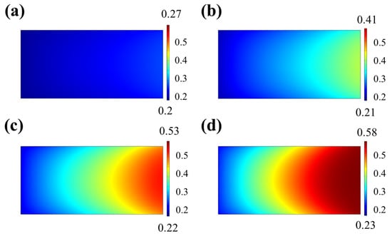 H2 distribution at different voltages of (a) 1 V; (b) 1.2 V; (c) 1.4 V; and (d) 1.6 V.