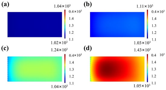 Temperature distribution under different voltages of (a) 1 V; (b) 1.2 V; (c) 1.4 V; and (d) 1.6 V.