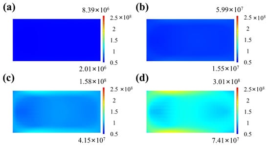 First principal stress distribution at different voltages of (a) 1 V; (b) 1.2 V; (c) 1.4 V; and (d) 1.6 V.