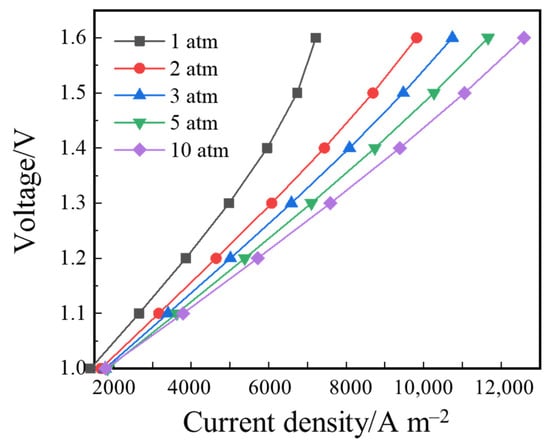 In this section, the effect of operating pressure on SOEC performance and physical field distributions are presented. Figure 9 gives the variation in I–V curves with the operating temperature. Clearly, a high operating pressure is beneficial to electrochemical performance; the higher the operating pressure, the higher the current density at the same applied voltage. With an operating pressure of 1 atm, the average current density is 7116 A/m2 at an applied voltage of 1.6 V; the value increases to 9817 A/m2 under an operating pressure of 2 atm, and further reaches 12,586 A/m2 under 10 atm. This trend is in accordance with the previous modeling study on a planar SOEC stack [,] and the experimental study []. The high operating pressure could improve cell performance through the following two mechanisms. First, a high operating pressure improves the reactant volumetric concentration. Thus, especially in regions near the outlet, the increased concentration of reactants could improve electrochemical reaction rates. Second, the higher operating pressure may also promote the transport of gas molecules, and thus lower the concentration overpotential. This is demonstrated by the more substantial performance improvement observed at higher current densities.