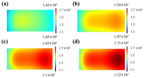 Temperature distributions under different operating pressures of (a) 1 atm; (b) 2 atm; (c) 5 atm; and (d) 10 atm.