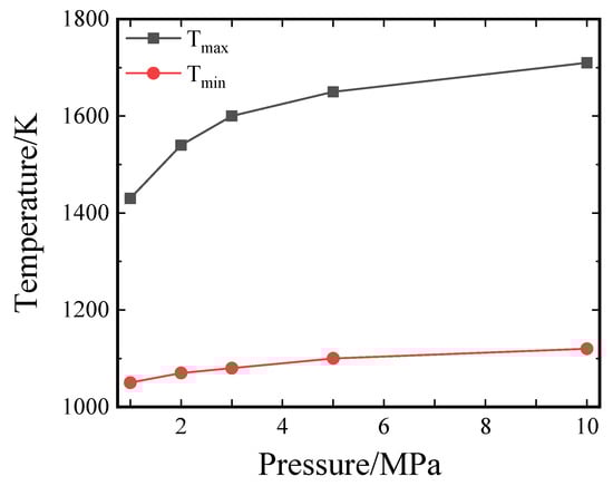 Figure 10 gives temperature distributions at different operating pressures. Evidently, with an increase in operating pressure, the temperature distribution becomes more uneven. Figure 11 summarizes the highest and lowest temperatures at each operating pressure. At 1 atm, the temperature difference between the highest and the lowest is 380 K, while at 10 atm, the difference increases to 490 K. Furthermore, a shift in the peak temperature region from near the inlet to near the outlet can also be observed. As mentioned above, the electrochemical reactions are endothermic and the chemical reactions are exothermic. The shift in temperature distribution implies a shift in the distributions of sites where the various reactions take place.