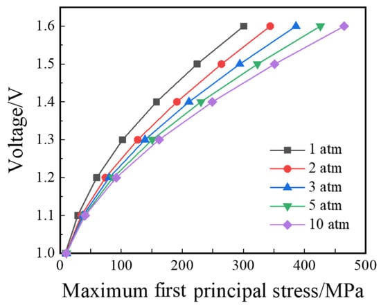 Correspondingly, increasing uneven distribution leads to higher maximum first principal stress, as shown by Figure 12. At 1.6 V, the maximum first principal stress increases from 301 MPa at an operating pressure of 1 atm to 465 MPa at an operating pressure of 10 atm. Thus, when aiming to achieve higher performance by operating the SOEC at elevated pressures, the potential cell degradation caused by the higher first principal stresses should also be taken into consideration.