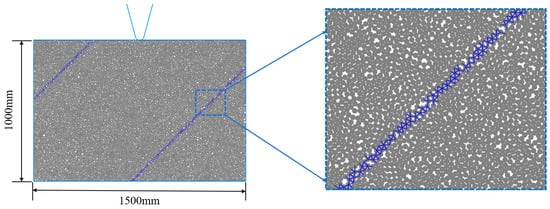 The numerical simulation is from a cognitive aspect. Figure 1 shows a schematic diagram of the PFC numerical model containing beddings used in this study. The bedrock part is simulated by the PB model, while the bedding plane part is realized by adding and replacing the SJ model. The model has a size of 1500 mm × 1000 mm, with a disc cutter placed above it. The disc cutter is generated using the Wall command in PFC, and the displacement loading mode is adopted to realize the penetration of the disc cutter into the bedrock. The mesoscopic parameters of PFC used in this study are obtained based on previous experience in parameter selection and trial calculations, as shown in Table 2.