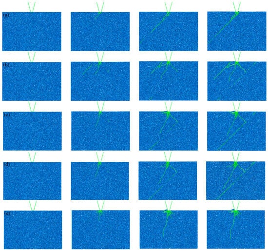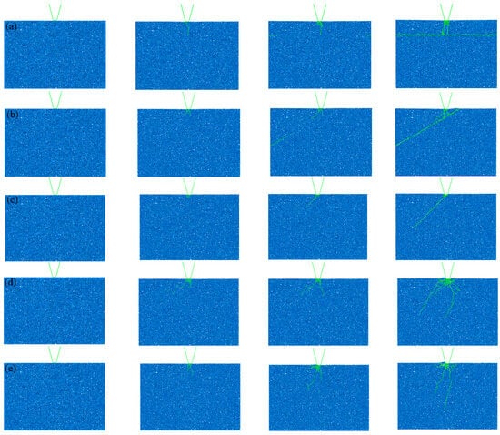 Law of crack propagation during TBM disc cutter rock breaking under different bedding dip angles. (a) α = 0°; (b) α = 30°; (c) α = 45°; (d) α = 60°; (e) α = 75°.