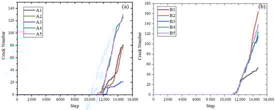 Crack–time step curves under different calculation schemes. (a) Scheme A; (b) Scheme B.