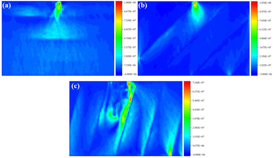 Maximum principal stress nephograms of disc cutter rock breaking under different bedding spacings. (a) d = 30 mm; (b) d = 60 mm; (c) d = 90 mm.