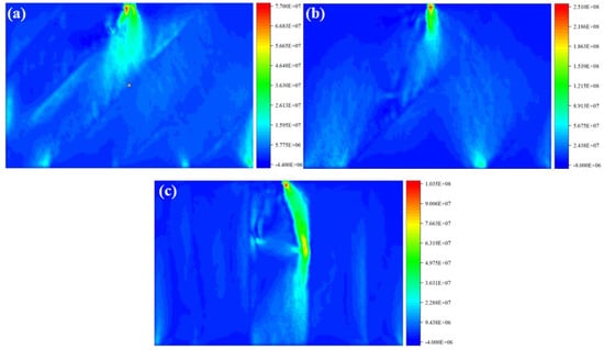 Figure 5 presents the maximum principal stress nephograms of disc cutter rock breaking under different bedding dip angles. As can be observed from the figure, when the bedding dip angle α = 0°, a typical stress concentration zone is formed by the disc cutter loading, which is also the reason for the formation of the “crushed zone”. Meanwhile, the stress concentration zone extends along the disc cutter loading direction, indicating that the subsequently formed “branch cracks” will propagate along the disc cutter loading direction, i.e., across the bedding direction. When the bedding dip angle α = 45°, similar to the case when α = 0°, a typical stress concentration zone is first formed at the contact part between the disc cutter and the bedrock. However, a tensile stress concentration zone is also formed along the bedding direction, which indicates that, after the “crushed zone” is formed, the “branch cracks” will propagate along the bedding direction. When the bedding dip angle α = 75°, the tensile stress concentration is mainly distributed at the bedding close to the disc cutter, indicating that the cracks are mainly damaged along the bedding.