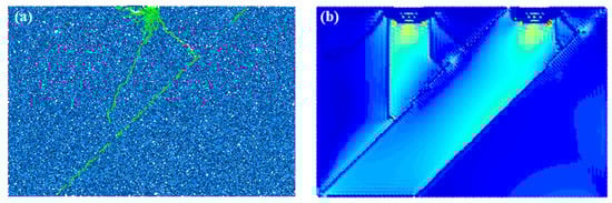 Figure 7 presents a comparative analysis of the crack propagation morphology and rock-breaking direction between the PFC2D results (from this study) and the SPH results (from previous research). As shown in Figure 7a (PFC2D results under specific bedding dip angles and spacing conditions in this study), the cracks induced by the disc cutter exhibit an obvious tendency to propagate along the bedding plane: when the bedding intersects the cutter–rock contact point, cracks penetrate directly along the bedding plane without forming an obvious “crushed zone”; when the bedding spacing falls within a specific range, the “crushed zone” interacts with two adjacent beddings. Most of the generated branch cracks extend along the bedding direction, while a small number propagate along the cutter penetration direction—ultimately resulting in rock fragmentation dominated by failure parallel to the bedding. This phenomenon is highly consistent with the SPH simulation results in Figure 7b: under the same bedding conditions in the SPH model, the disc cutter also induces cracks that preferentially propagate along the bedding plane, with no large-scale “crushed zone” formed, and a significant proportion of branch cracks distributed along the bedding direction.