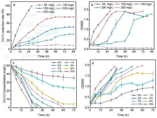 Effect of Cr (VI) concentration on (a) Cr (VI) reduction and (b) strain concentration changes, and the effect of NaCl on (c) Cr(VI) concentration and (d) strain concentration.