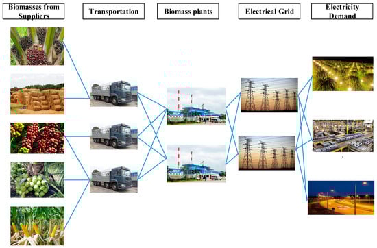 Nowadays, there has been a significant increase in energy generation from renewable energy resources in many countries. Therefore, supply chain planning for renewable energy production and distribution has become an important task in order to achieve high operational efficiency []. There are many forms of energy that can be generated, but electricity is the most common due to its ability to be distributed over high-voltage power lines. Biomass is an available renewable energy resource and is abundant in most countries that rely on agricultural industry.