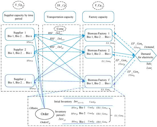 In general, there are many types of biomass available from many suppliers that can be collected and transported to biomass plants in order to generate electricity and satisfy demand, as shown in Figure 1. Due to their locations, each supplier has specific types of available biomass. As a result, biomass supply capacity varies by supplier and type of biomass. Besides, the availability of biomass depends on the season, and available quantities vary throughout the year. The peak season for some types of biomass may be off-season for others.