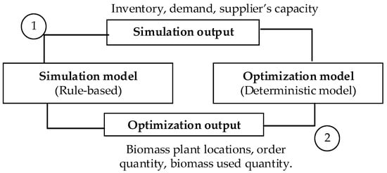 In the hybrid model, an optimization model was formulated and integrated with the simulation model. The optimization model was formulated as a mixed-integer programming model, which was integrated with the Matlab Simulink model. Uncertainty from demand and supplier capacity is considered in the model, and the values of demand and supplier capacity are generated from the simulation model and used as input to the optimization model. The optimization model defines core parameters and decision variables for the simulation model in each period, in which an interactive process enables the hybrid model to automatically consider whole periods []. Data from different regions of Vietnam were used to determine the optimal biomass plant locations.