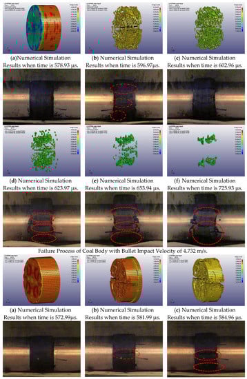 It can be seen from the high-speed images that when the impact velocity was 4.732 m/s, the sample was compressed by pressure, the coal was laterally deformed, and many transverse cracks were created parallel to the direction of stress wave propagation (indicated with a red circle in the Figure 16). With the development of cracks, the whole sample appeared to expand, and eventually, damage occurred under the joint action of upper crack expansion and the lower slip shear of the coal body. When the impact velocity was 7.267 m/s, first a through crack was created in the sample (shown by a red circle in Figure 16). Secondly, due to the large incident energy and high velocity of the bullet, the deformation of the coal continued to increase, and the crack expanded rapidly. Finally, the sample underwent compression expansion under impact loading, which caused tensile damage. As the speed continued to increase, the coal sample underwent a “comminuted” rupture, producing a large amount of fine granular coal dust. The severity of coal body damage positively correlated with the impact velocity, while the size of the coal block was decreased.