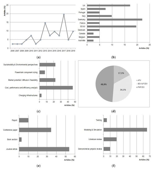 The results included in Figure 2a–g show that most of the documents available were written from 2013 to 2019, in scientific journal article format, principally published in Germany, US and UK, focused on light-duty vehicles (passengers and commercial use) with topics related with economic aspects, market feasibility and environmental perspectives and focused on battery and fuel cell competitiveness or hybrid-electric commercial vehicles using modeling or simulation methodologies.