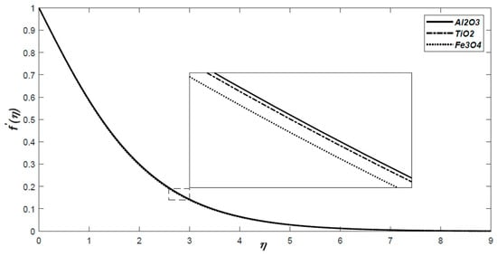 The dimensionless velocity profiles for volume fraction  for all three nanofluids with respect to similarity variable .
