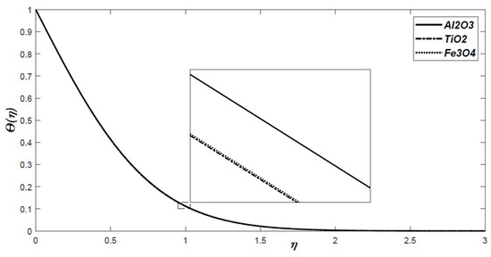The dimensionless temperature profiles for  for all three nanofluids with respect to similarity variable .