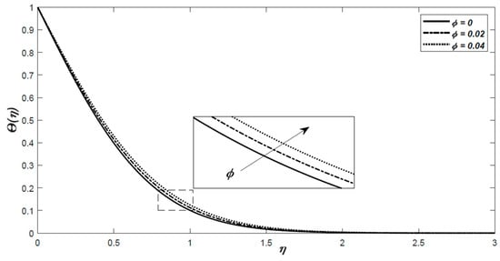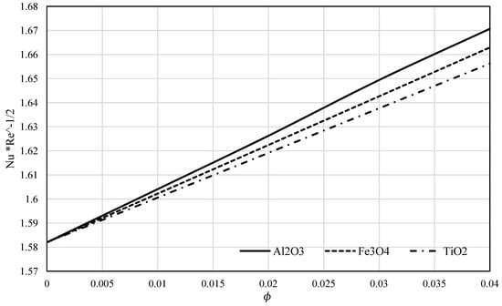 Using the fourth-order method (bvp4c) in MATLAB, the system (15) and (16) is solved with conditions (17) and (18), when the nanofluid properties are calculated according to formulas (8)–(11) using the thermophysical values given in Table 1 for Al2O3, TiO2, and Fe3O4 particles, as well as the base fluid of suspension water. Our aim was to investigate the impacts of the volume fraction and nanoparticle’s material type on the heat and mass transfer characteristics.