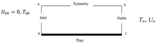 The CFD simulations have been performed for the laminar nanofluid flow, according to Figure 5, and Equations (1)–(3) were discretized and solved using ANSYS 18. The sheet was maintained at a constant temperature  = 400 K. The fluid flows with constant velocity and the temperature outside the thermal boundary layer was  = 300 K. The length of the plate was . For the computational domain and mesh, the computational domain geometry was generated using Design Modeler, and the grid was generated using ANSYS Fluent mesh. The CFD domain consists of inlet and outlet, which had been divided by the number of division type with 100 divisions; the behaviour was set to hard, with bias factor 40, in order to increase the number of subdomains near to the plate and increase the preciseness near the wall. The boundary conditions had been set up as follows: side AD is symmetry, BC is the wall, AB is the velocity inlet, and CD is the outlet. Both AD and BC were divided using the same method, with 200 divisions. A laminar model was used with pressure–velocity coupling. The relaxation factor was 1 for density; body force and energy, the thermophysical properties of nanofluids (including density, thermal conductivity, viscosity, and thermal capacity) were calculated using a single-phase approach. In order to check grid sensitivity, the local Nusselt number was evaluated. A comprehensive mesh sensitivity study had been done to minimize the numerical influences introduced by the size of the meshes. The analysis of the mesh sensitivity had been done for five meshes (with the number of cells being 7000, 9600, 14,400, 20,000, and 26,400), and the Nusselt number on the plate for each mesh had been compared. It was noticed that the Nusselt number for the mesh with 20,000 cells was found to be satisfactory to ensure the accuracy ( of the solution, as well as the independency of the grid, which was applied in the further simulations.