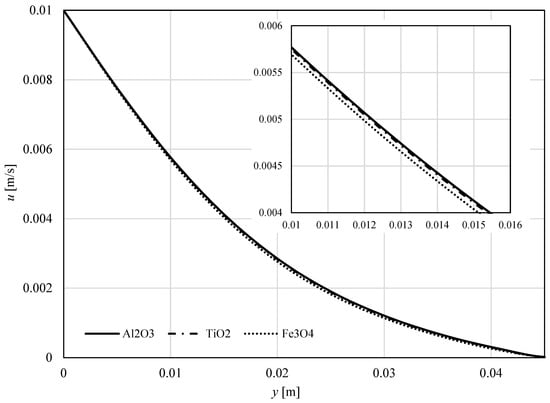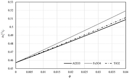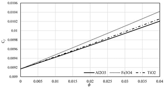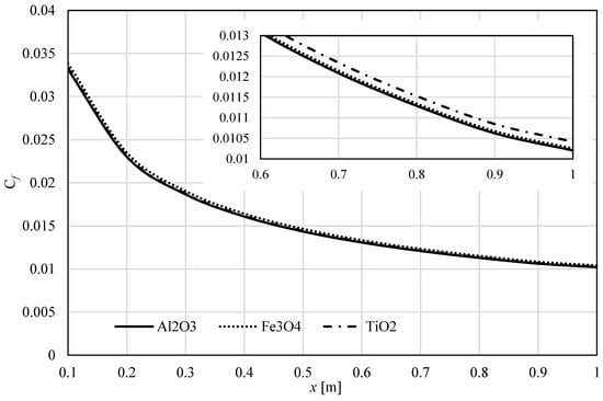 The skin friction coefficient and the local Nusselt number were analysed using CFD simulations. Figure 10 exhibits the impact of the nanoparticle’s material on  for  along the flat surface. We found that the skin friction is higher Fe3O4 than for Al2O3 and TiO2.