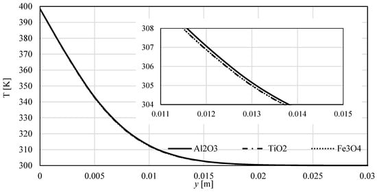 Temperatures profiles perpendicular to the sheet for all three nanofluids; .