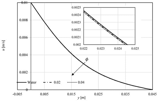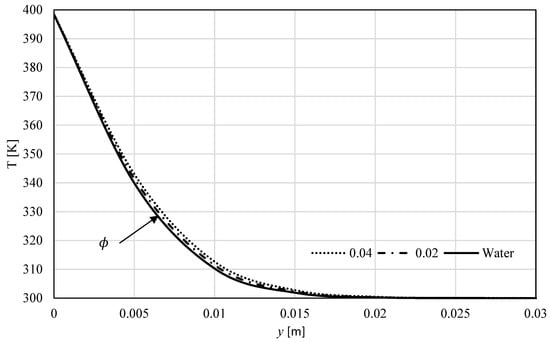The impact of the nanoparticle’s concentration was investigated on Al2O3–water nanofluid in Figure 8 and Figure 9. It follows, according to Figure 3 and Figure 4, that more additives will reduce the velocity and increase the velocity.
