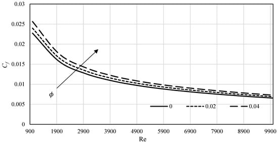 The skin friction coefficient variation with the Reynolds number is shown in Figure 11 for Al2O3 in the range of the corresponding Reynolds number. We can observe that the larger  is, the larger  is.