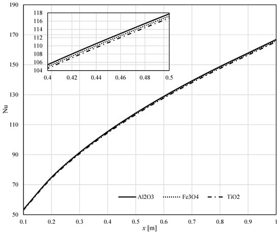 Figure 14 depicts the variation of the Nusselt number along the sheet surface. One can see a slight difference along the x-axis for all three nanofluids when . The bigger values for Nu were obtained for Al2O3.