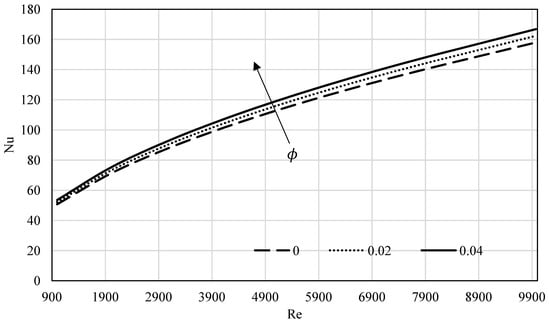 The influence of the volume fraction on the local Nusselt number is investigated in Figure 15 for Al2O3 in the range of Reynolds number 900–9000. It can be seen from the figure that the increase in ϕ will induce an increase in the Nusselt number as well.