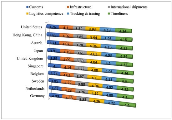 The United Nations proposed 17 developmental goals to the world community in 2015, among which climate change and smart technologies are mostly emphasized to minimize carbon damages and ensure sound and healthy economic recovery through which a country can reduce poverty and hunger issues []. The green supply chain management practices can mitigate climate issues through technological up-gradation in logistics activities and ensure low carbon base activities through which global average temperature could be reduced up to 1.5 °C, as suggested in COP25 in Madrid, 2019 [,,,]. According to the latest report of World Bank [] that discussed the world ranking of overall logistics performance, Germany is placed in first position for logistics performance index (LPI) score, i.e., 4.19 out of 5, Netherlands in the second position, i.e., 4.07, Sweden, Belgium, Singapore, United Kingdom, Japan, Austria, Hong Kong China, and United States are placed in the following positions with an LPI range of 3.92 to 4.07. The LPIs consist of six critical dimensions: customs clearance process, quality of trade infrastructure, competitive price shipments, logistics competence and quality services, tracking and tracing consignments, and expected timeliness of delivery products. Figure 1 shows the top 10 logistics countries’ profiles of their six key dimensions.