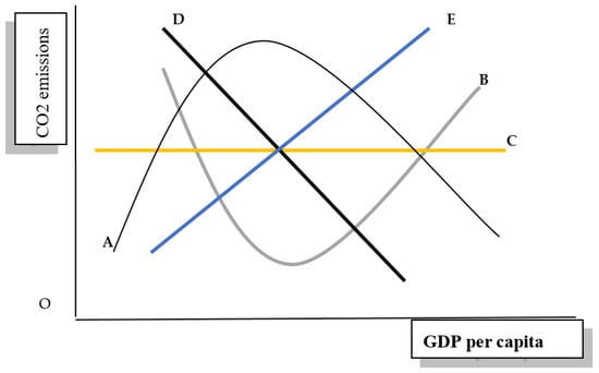 - Environmental Kuznets Curve (EKC): The EKC shows the non-linear relationship between income per capita and per capita carbon emissions at the second-degree quadratic version. The nominal GDP per capita and its second degree confined its positive and negative impact on carbon emissions, respectively, to substantiate an inverted U-shaped EKC hypothesis [,,]. The other forms could also be found under different socio-economic and environmental factors across varied economic settings [,]. Figure 2 shows the five different possibilities of EKC hypotheses to clearly understand the given concept to use in a given study for more critical insights. Line A shows an inverted U-shaped relationship between the country’s income and carbon emissions, which first increases than decreases carbon emissions due to vital environmental reforms being done through the country’s economic growth. Line B shows the U-shaped relationship between the two stated factors that show carbon emissions decrease initially with the country’s economic growth that later increases due to high industrialization caused by continued economic growth. Line C shows the flat EKC hypothesis, which argued that both the variables have no relationship. Line D shows monotonic decreasing function, while line E shows the monotonic increasing function that shows only one portion of the EKC hypothesis, either from the right side or left side, while the latter is insignificant.
