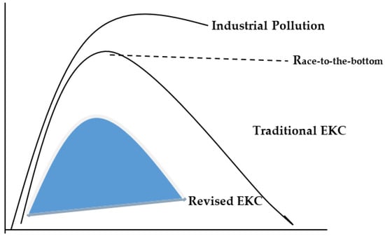 - New Toxic Pollutants, Race-to-the-Bottom Hypothesis, and Revised EKC Hypothesis: The rapid industrialization shifts country’s structural transmission mechanisms to using high-tech products that cause new toxic pollutants in the atmosphere, thus showing a single right-sided portion of EKC hypothesis. Further, due to developed countries’ stringent environmental regulations to restrain the polluting industries, the production units shift widely from developed to developing countries, thus showing the race-to-the-bottom hypothesis. Finally, due to technology infusion and broadcasting, environmental awareness programs burden less developed countries to limit carbon emissions through fewer resources. Thus, the EKC hypothesis’s kurtosis and its diameter fall short of the conventional EKC hypothesis (see Figure 3).