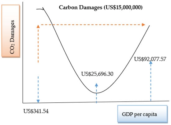 The results further show that medium and high-tech industry and technological factors are affiliated mainly with increased carbon damage in the form of high carbon abatement cost. Simultaneously, adequate insurance coverage and green financing services reduce the intensity of carbon emissions damage across countries. The results, although not supported by the inverted U-shaped EKC hypothesis in the relation of the country’s economic growth and carbon damages, however, tend to show a U-shaped relationship between them. The result implies that at the initial level, when the country’s income is just at US$341.54, the intensity of carbon damages was at a maximum of US$385,000,000,000, however, after reaching US$25,696.30, the cost of carbon emissions decreases at US$1,50,00,000. However, at later stages, when the country’s income grew more and reached its highest level, i.e., US$92,077.57, the cost of carbon emissions reached again at its maximum level. The complete description can be found in Figure 5.