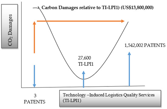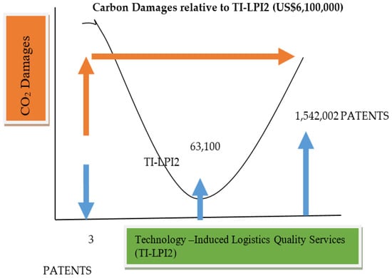 The moderation effect is included in Equations (3) and (4a). The technological factors, including patents application and trademark applications, are induced with logistics indices to assess green supply chain management practices and found a U-shaped relationship between carbon damages and moderation of technological factors. The result implies that carbon damages peak at US$385,000,000,000 while patent applications are lowest at 3 in number; however, when technology-induced LPI1 was included in carbon modeling, the technology-induced LPI1 reaching 27,600 applications, it turns to decrease carbon damages up to US$13,800,000. Further, when patent application reached its maximum level, i.e., 1,542,002 in number, carbon damages reached its maximum. Similarly, when the moderation effect of patents application induced with LPI2, it mainly decreases carbon damages up to US$6,100,000 at a threshold level of 63,100 patent applications. The complete description can be seen in Figure 6 and Figure 7.