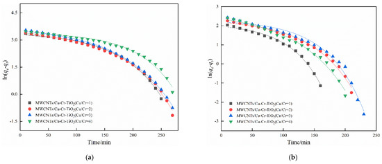 The above adsorption kinetics were fitted and analyzed to understand the adsorption process of SO2 and NO on MWCNTs/Cu-Cr-TiO2. The fitting results and the parameters are shown in Figure 12, Table 3 and Table 4.