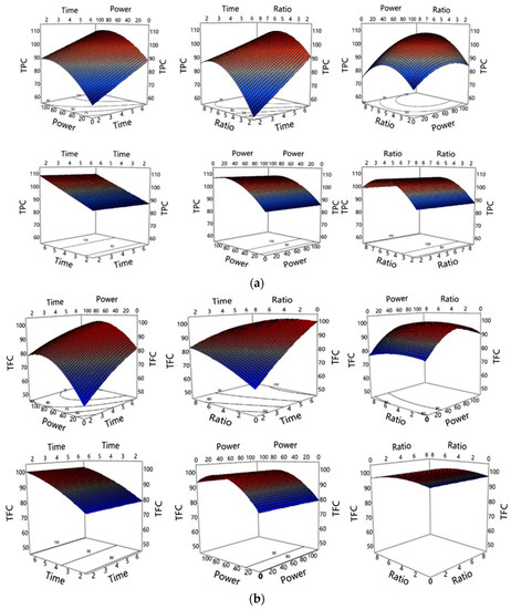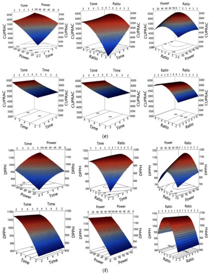 The regression analysis results in Table 2 show the individual, interaction, and quadratic effects of MAE parameters on the extraction yield of polyphenols (TPC, TFC, and Pro. A) and antioxidant capacity (measured by FRAP, CUPRAC, DPPH, and ABTS). Figure 2 also depicts the linear effects of extraction parameters on the extraction yields. The extraction parameters linearly, positively, and significantly (p < 0.05) affected the extraction yield of TPC. Conversely, the quadratic effects of all three parameters on TPC yield were negative, but only the sample to solvent ratio’s influence was significant (p < 0.05). The interaction effects of the extraction parameters were insignificant and negative for TPC, however, the effect of the interaction of power × ratio was positive. Figure 3a–c depicts the 3D surface profiles for interaction and quadratic effects of extraction parameters on phenolics. For TFC and Pro. A, the radiation time and power positively and significantly influenced the extraction yield. However, the influence of sample to solvent ratio was insignificant for both TFC and Pro. A. There were also no significant interaction effects between MAE tested parameters on both TFC and Pro. A yield. The quadratic effect of power was not only significantly but negatively influential to the TFC and Pro. A content in the extract.