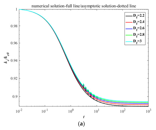 For simplification and without loss of generality, the calculation can be non-dimensionalized through the following relations: M0 * = M0 /M00, M1 * = M1/M10, M2 * = MC0M2/M20, , ke * = ke/(M00kbT), . Then the Equation (7) coupling with Equations (15) and (19) can be solved numerically by means of fourth-order Runge–Kutta method with the initial dimensionless conditions set as M00 = 1, M10 = 1, M20 = 4/3, ke0 = 1/2 (the star symbol ‘*’ is omitted thereafter). The numerical and asymptotic solutions of kinetic energy and surface area are shown in Figure 2. According to the principle of equipartition of energy, the agglomerates share the molecular thermal motion of the fluid and have the same initial kinetic energy, thus the dissipative rate of ke strongly depends on the collision rate. The evolutions of kinetic energy with time show the larger descent at lower fractal dimension because of the larger collision radius, which result in a more rapid agglomerated rate [22]. Oppositely, the contacting surface between primary particles in an agglomerate with smaller fractal dimension is less than that in an agglomerate with larger fractal dimension, thus the decay of surface area shows the reverse trend in the dual role of the higher specific surface area and more rapid agglomerated rate.
