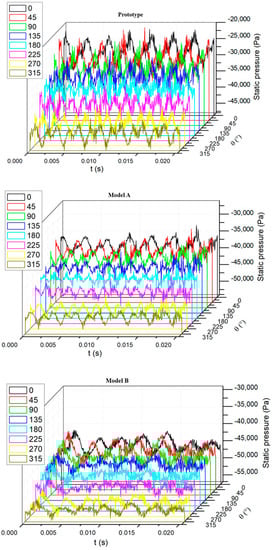 According to Figure 6, the blade-passing frequency was 688 Hz where the amplitudes were dominant among the frequency domains. The simulation result that the amplitudes were dominant at agrees with former research that showed that the blade–tongue interaction is the main source contributing to pressure fluctuations [21,25]. The amplitudes of the spectra at eight monitor points were normalized and are presented in Figure 7. Because of the employment of splitter blades, there was another peak, whose amplitudes are shown in Figure 8, and was motivated at the frequency of 344 Hz, which is half of the . As is seen in Figure 7, the spectra amplitudes at and 0.5 of the four models were distributed at the eight circumferential positions in a nearly synchronized manner. The difference of the amplitudes of the four models can be clearly figured out, which indicates that there was a gradient of pressure fluctuation intensity among the four models. The prototype had the strongest pressure fluctuation intensity, followed by models A, B, and C. Former investigations [5,13] have demonstrated that the amplitudes at the circumferential position should present a tendency with 14 local peaks and valleys because of the blade–tongue interaction. However, there were only eight monitor points, so it was unable to be exhibited. The pressure fluctuation curves of the prototype and the modifications at the circumferential positions against the time domain are presented in Figure 8. The figures show the static pressure plots within the time of one circle. It is shown that the curves of the prototype had stronger fluctuation and the fluctuation intensity was gradually mitigated from Model A to Model C. The standard deviations of the pressure fluctuation plots around the circumference of the impeller outlet were also extracted and normalized in Equation (2), which can be regarded as an indicator of pressure fluctuation intensity.