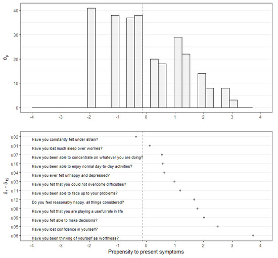 Person-item map (propensity to present symptoms) of dichotomized scale of poor mental health (GHQ-12) in logits.